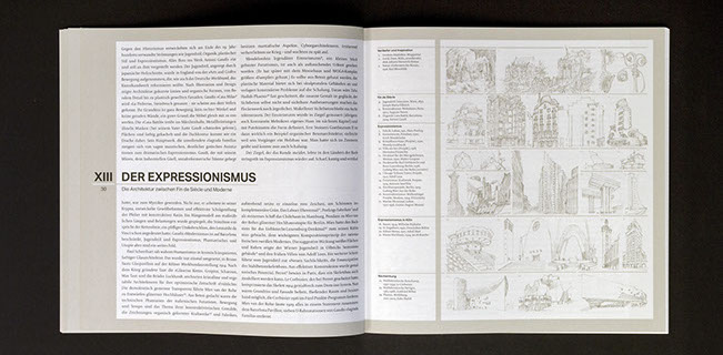 Während sich im ersten sachlichen Teil deskriptiver Text und penibel in Blei ausgeführte Bildtafeln, streng gegenüber stehen, erlaubt sich der zweite Teil größere Freiheiten. Die Essays werden mit collagehaften und gröberen Tuschezeichnungen illustriert.