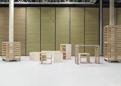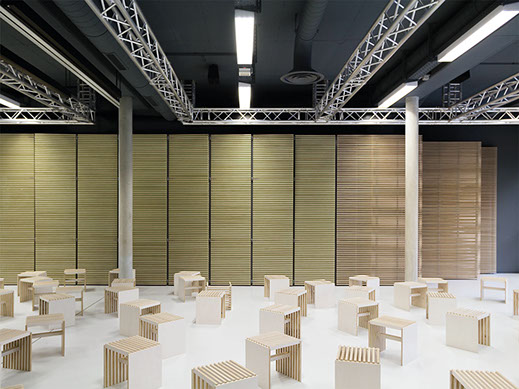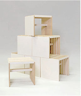 freiheiten für unerwartete, neue phantasievolle Nutzungen anbieten: der »Hocker« (sitzen/ bauen), die »Materialwand« (aufbewahren/präsentieren), und der »Rahmen«, nutzbar als kleiner Tisch, als Bock für einen größeren Tisch, als befüllbarer (Roll-) Container für Material, Präsentationssystem oder Bauelement. Durchgängiges Material für das Mobiliar ist eine weiß lasierte Multiplexplatte, an deren Kanten das helle geschichtete Holz sichtbar bleibt.
