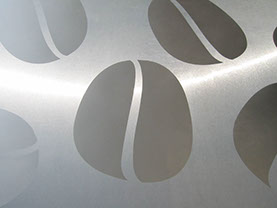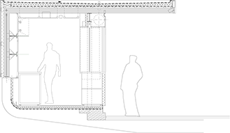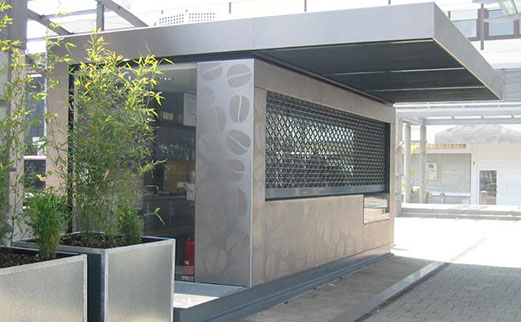 Die Cafébar setzt sich aus zwei blechbekleideten Elementen zusammen: einem Block mit integrierter Ausgabetheke und einem L-förmigen Dach, das sich aus der Brüstung über der rückseitigen Tiefgarageneinfahrt entwickelt, den Innenraum umfasst und zum Platz hin als Vordach auskragt. Die Oberfläche des Edelstahlkörpers ist mit einem Kaffeebohnenornament satiniert.