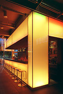 Der gläserne Lichtkubus, der die Thekenbereiche auf zwei Ebenen umfasst, integriert sich in die kühle Ästhetik des Hauses. Tagsüber verhält sich der gläserne Barkörper zurückhaltend. In der Dämmerung beginnt er zu leuchten, erkennbar als eigenständiger Bereich.