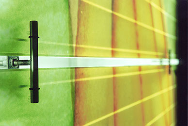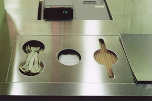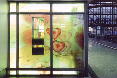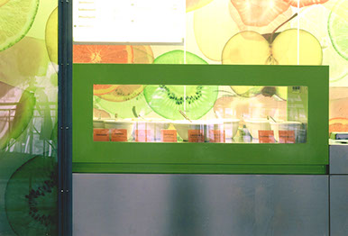 Eine separat eingestellte und hinterleuchtete Innenfassade mit Obstmotiven aus bedruckten Stegdoppelplatten schafft die Kulisse für das Zubereiten der Säfte. Die orangefarbene Theke mit den verchromten Entsaftern, die grüne Quarkvitrine und die leuchtende Fruchtwand sind die Elemente für das Wiedererkennen an unterschiedlichen Orten und Situationen.