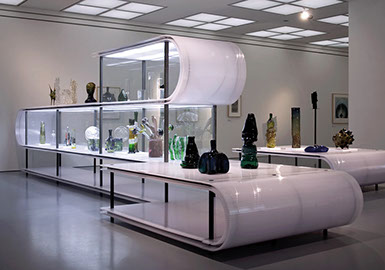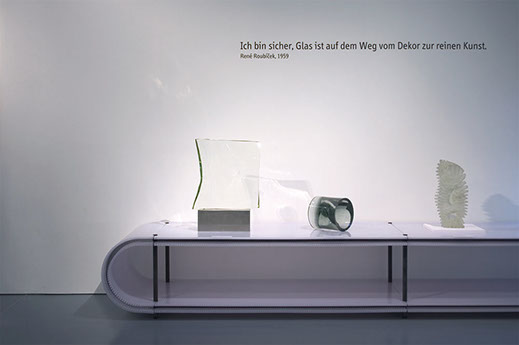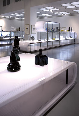Für die Präsentation von Glaskunst im Museum Kunst Palast ist ein Ausstellungskonzept entwickelt worden. Das Vitrinensystem »Shelf« integriert die Beleuchtung in ein weißes Band, das die Exponate auf jeder Ebene optimal beleuchtet und präsentiert.