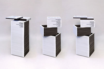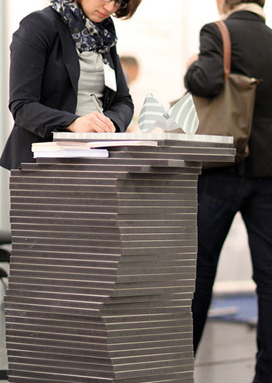 Für die zentrale Studienberatung der Technischen Hochschule Köln wurde eine Messepräsentation entwickelt. Idee ist eine an Bücher- oder Papierstapel erinnernde Stehle, als Symbol für Wissensvermittlung.